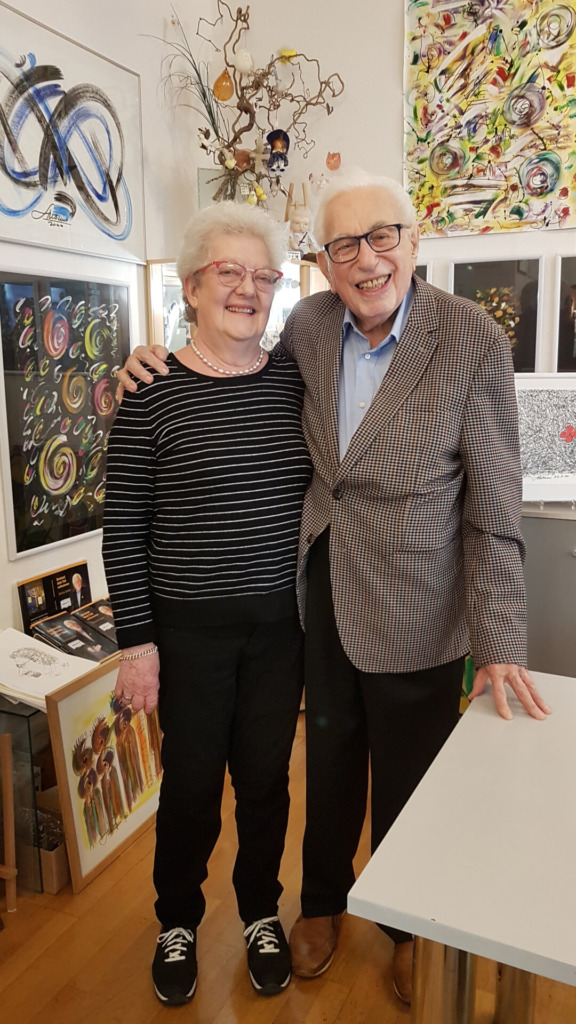 Eine Viertelstunde später sitze ich Shlomo Graber und seiner Lebenspartnerin Myrtha Hunziker inmitten seiner schwungvoll gemalten, fröhlich-bunten Bilder in der Galerie gegenüber. Seit 36 Jahren lebt Shlomo als Kunstmaler und Autor in Basel. Seine bald 99 Jahre merkt man ihm nicht an. Seine blauen Augen blicken klar und aufmerksam. Wenn er spricht, lächelt er oft. Ab und an winkt er Passanten zu und findet, der Mann, der draussen die Weihnachtsdekoration abmontiert, solle doch zum Kaffee hereinkommen. Dann beginnt er ohne weitere Umschweife zu erzählen.