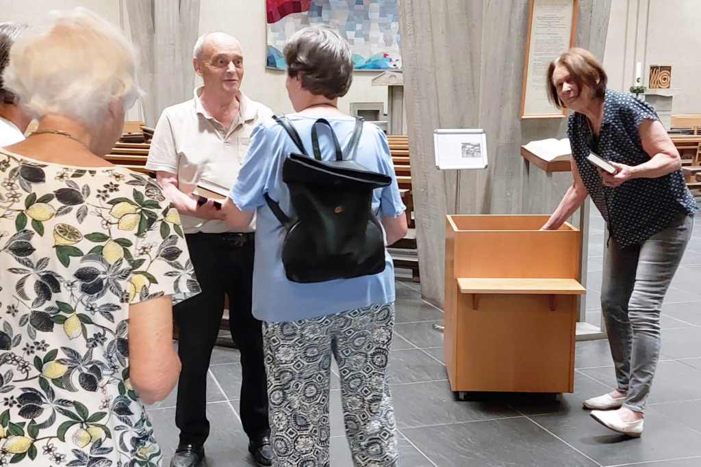 Son­ntag­mor­gen, die Gottes­di­en­st­be­sucherin­nen und ‑besuch­er der Pfar­rei St. Peter und Paul in Allschwil betreten das Kirchenge­bäude. Statt des stillen, anony­men Griffs zum Gesangs­buch gibt es hier eine Begrüs­sung. «Guete Morge!» sagt Renate Haslimeier lächel­nd und gibt den Ank­om­menden ein Buch in die Hand. Manche Men­schen grüssen ein­fach zurück, mit anderen wech­selt sie noch ein paar Worte, bevor sie sich einen Platz in der Bank suchen.