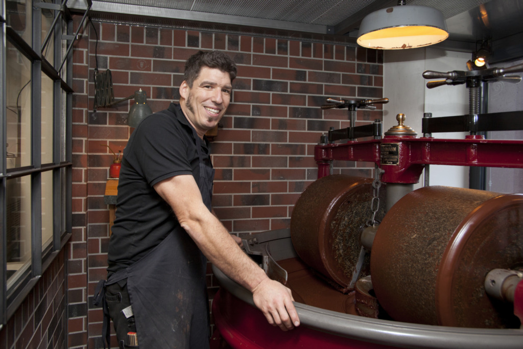 Der gelernte Konditor-Confiseur nahm schon früh an Berufswettkämpfen teil, Kreationen mit Schokolade gelangen ihm jeweils besonders gut. Nachdem er in Luzern für einen Investor ein Geschäft aufgebaut hatte, war für ihn der Zeitpunkt gekommen, ganz auf Schokolade zu setzen. «Schokolade allein ist so spannend, dass ich gar nichts anderes brauche», sagt Fabian Rimann, «mein Beruf ist kreativ, die Möglichkeiten sind riesig.» In den USA, wo er Kurse an der Konditorschule in Orlando gab, kam Fabian Rimann erstmals mit der «Bean-to-Bar»-Philosophie in Kontakt, die er heute in seinem Laden verfolgt. Damit ist gemeint, dass er von der Kakaobohne bis zur fertigen Tafel alle Verarbeitungsschritte in seiner Werkstatt macht. 60 Prozent der Schokolade, die Rimann verkauft, wird vor Ort produziert.