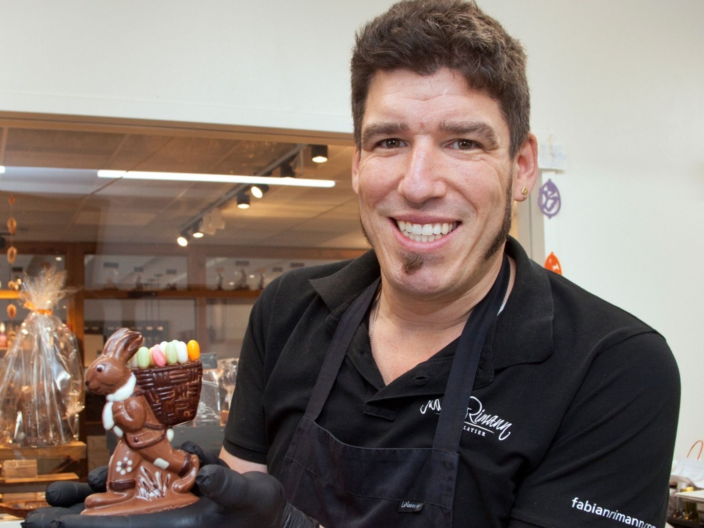 Schokolade macht offensichtlich glücklich. Im Duft der Kakaobohnen, zwischen Gestellen voller Pralinés und mit dem Geräusch der mächtigen Conchiermaschine im Ohr, strahlt der Chocolatier Fabian Rimann mit seinem Schoggiosterhasen um die Wette.