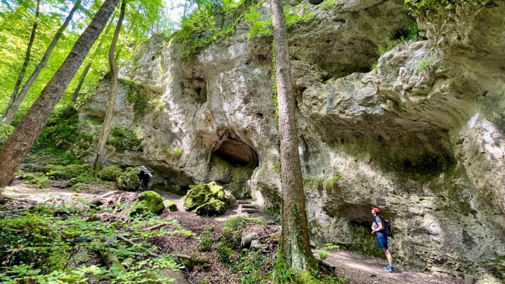 Nach einem Gang durch die pastellfarbene barocke Basilika ziehen wir hinaus ins Grüne. Bald beginnt der Weg zu steigen. Auf den Jurahöhen rundum entdecken wir immer wieder Burgen. Eine davon lädt zum Übernachten ein, die Jugendherberge von Mariastein.