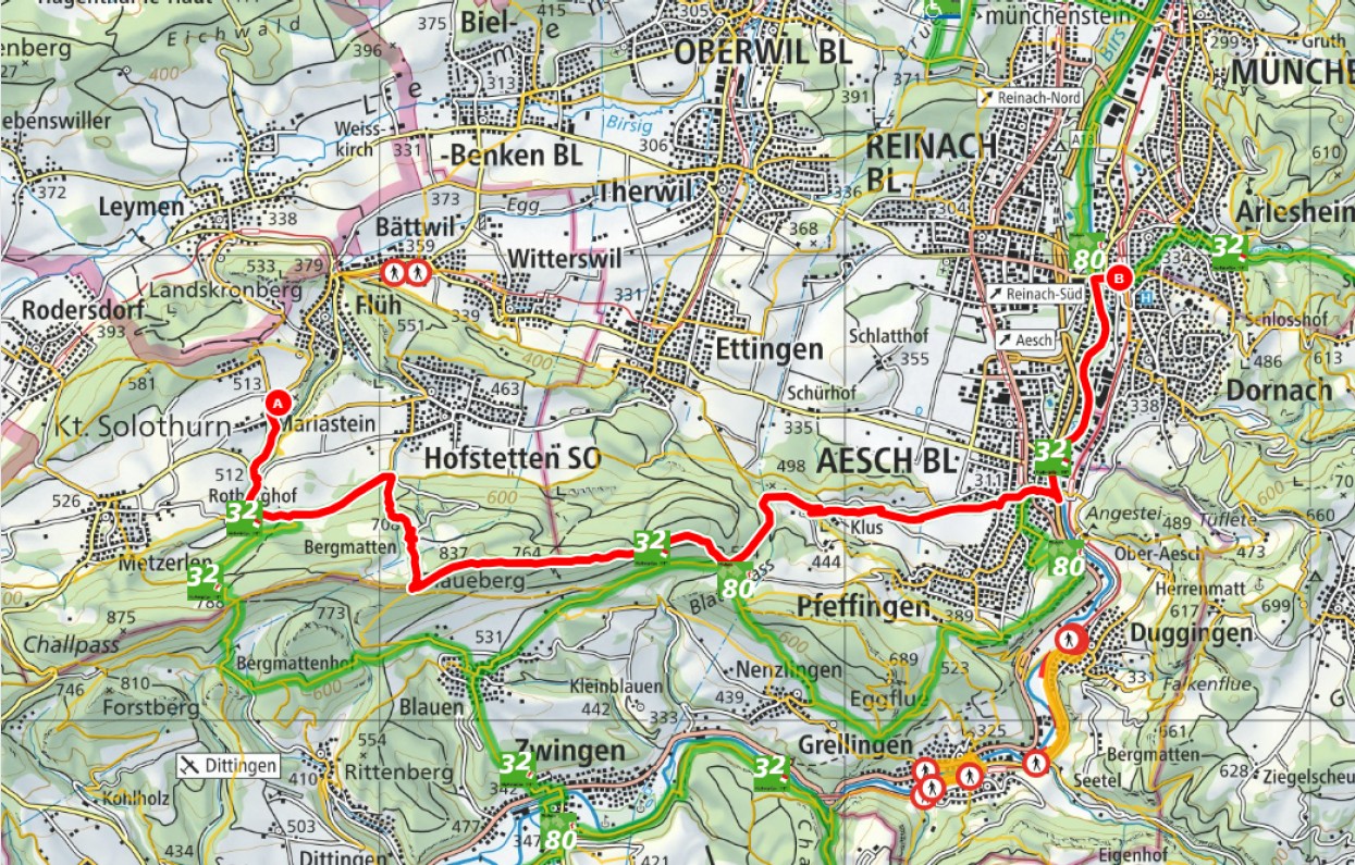 Eine weitere Abkürzungsmöglichkeit ist es die Wanderung bereits am Bahnhof Aesch zu beenden und den 40-minütigen Spaziergang der Birs entlang zum Kloster Dornach wegzulassen (oder mit dem ÖV zurückzulegen). Hier gelangen Sie zur Tour auf der Karte von Schweizmobil